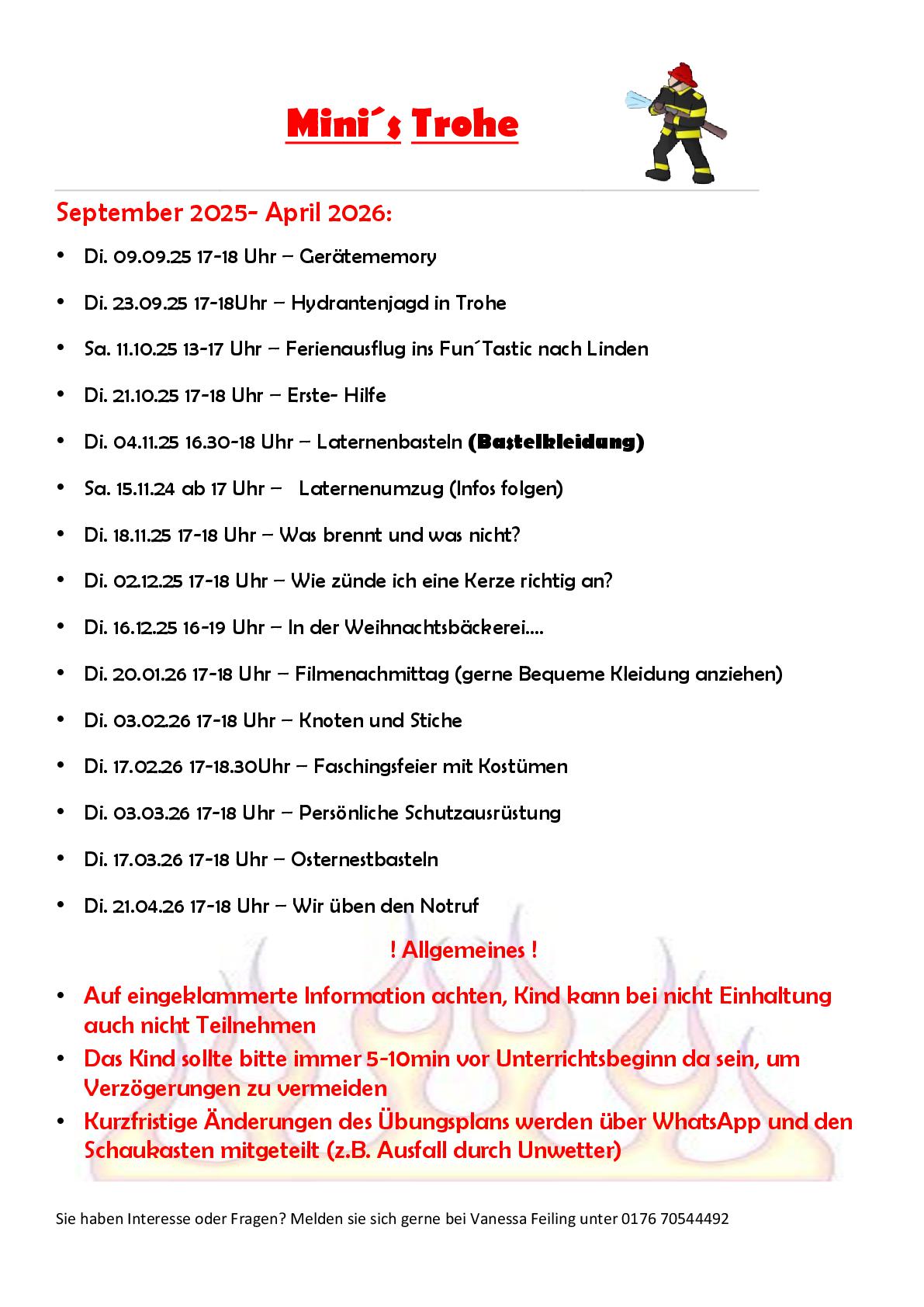 Wir treffen uns alle zwei Wochen dienstags zur Minifeuerwehr von 17:00 bis 18:00 Uhr am Feuerwehrhaus Trohe. Ansprechpartner sind Vanessa Feiling, Dana Koch und Wesley Schick.